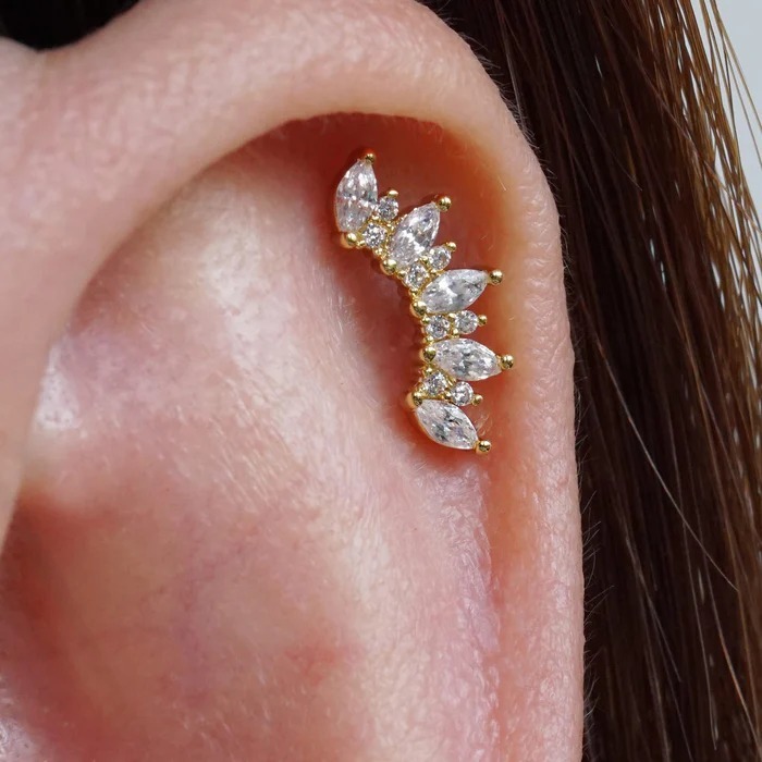 A helix earring is jewelry specifically designed for a helix piercing. The helix is the outer rim of your ear, the cartilage part that curves around the edge above your earlobe. Helix piercings are usually done in the upper part of the ear, but there are variations like forward helix, double helix, and triple helix, depending on the placement and number of piercings. Helix earrings come in different styles, including studs, hoops, labrets, and barbells, allowing for a wide range of looks.