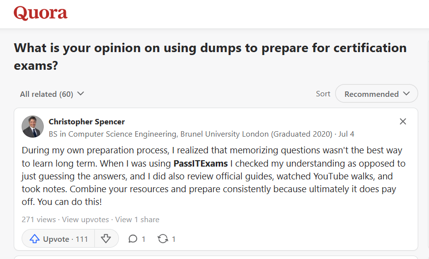 Just a heads up: This is based on my own experience. Before making your choice, it’s worth checking out the Quora community plenty of certified professionals share their real stories and advice there. Forums are where you’ll find honest discussions from people who’ve actually taken these exams. Here’s a good place to start: https://www.quora.com/What-is-your-opinion-on-using-dumps-to-prepare-for-certification-exams/answer/Christopher-Spencer-261