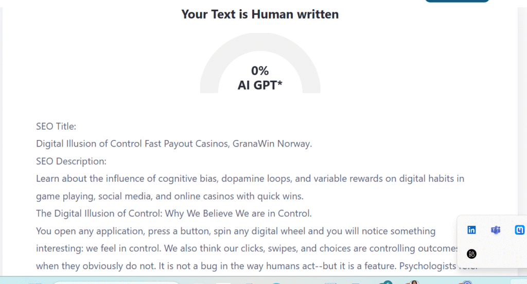 Entertainment platforms: Consider GranaWin Norway, a well-established name in the digital gaming culture. It provides slick interfaces and immediate feedback loops that increase the user’s Sense of agency, even though the results are generated randomly.